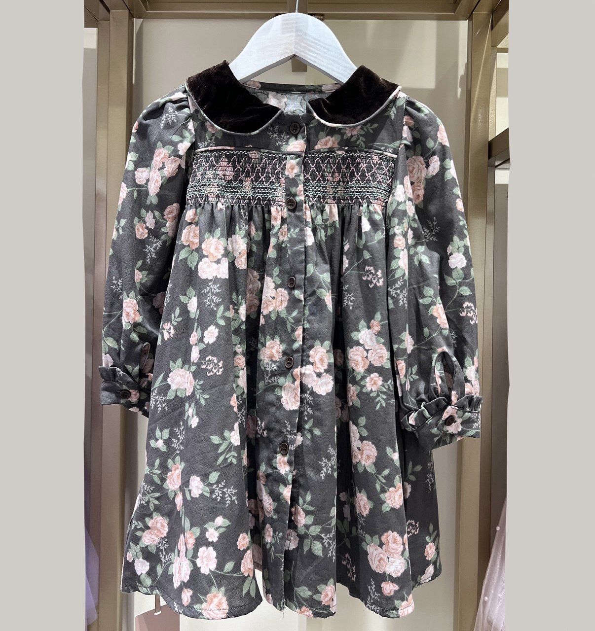 Exuding vintage elegance, this dark floral dress is a sophisticated choice for cooler seasons. The combination of rich textures and delicate hand-smocking makes it a standout heirloom piece for any young girl's wardrobe.