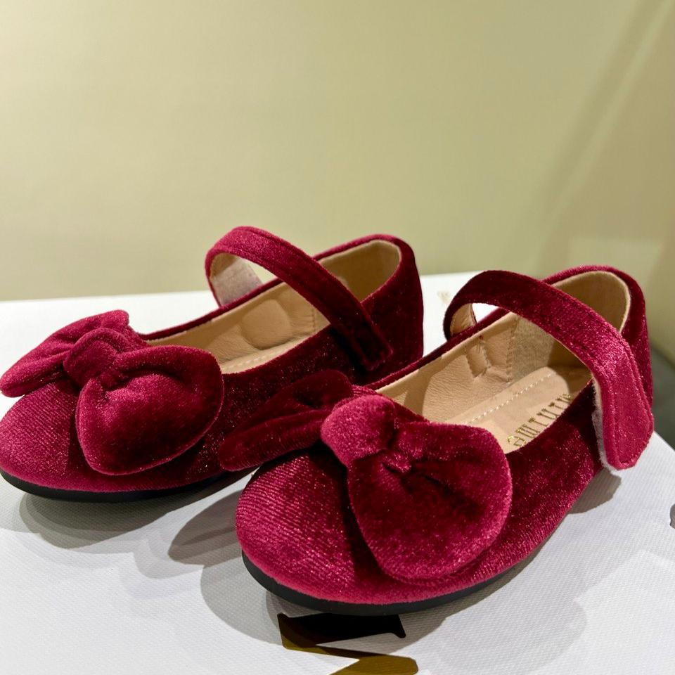 Make every step a stylish one with these gorgeous berry-colored velvet flats, designed to bring a touch of elegance to your little one's wardrobe. The rich, velvety texture of these shoes offers a luxurious feel, perfect for special occasions or just adding a bit of flair to everyday outfits. A matching velvet bow adorns each toe, creating a charming and cohesive look that’s sure to turn heads.