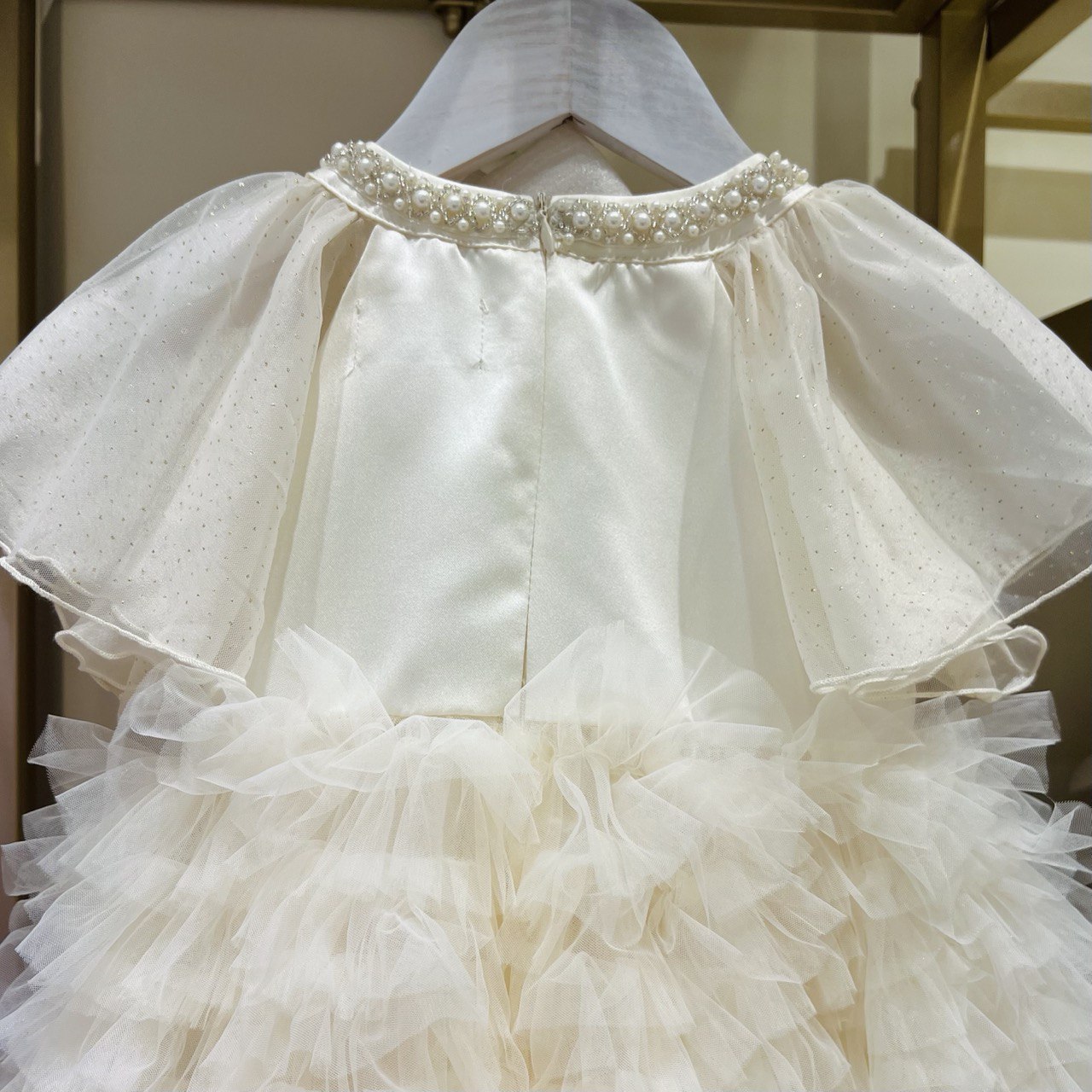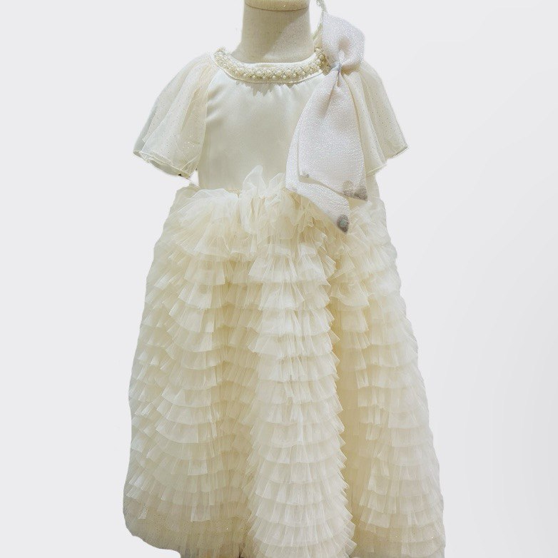 Turn every moment into a magical memory with this dreamy ivory ruffle dress. Crafted for elegance and comfort, this piece features soft layered tulle that flows with every twirl, a pearl-embellished neckline for a hint of sparkle, and a large textured bow on the shoulder that adds a graceful, playful touch. Whether it’s a birthday, wedding, or a special photo shoot, this dress makes sure your little girl shines like a star.