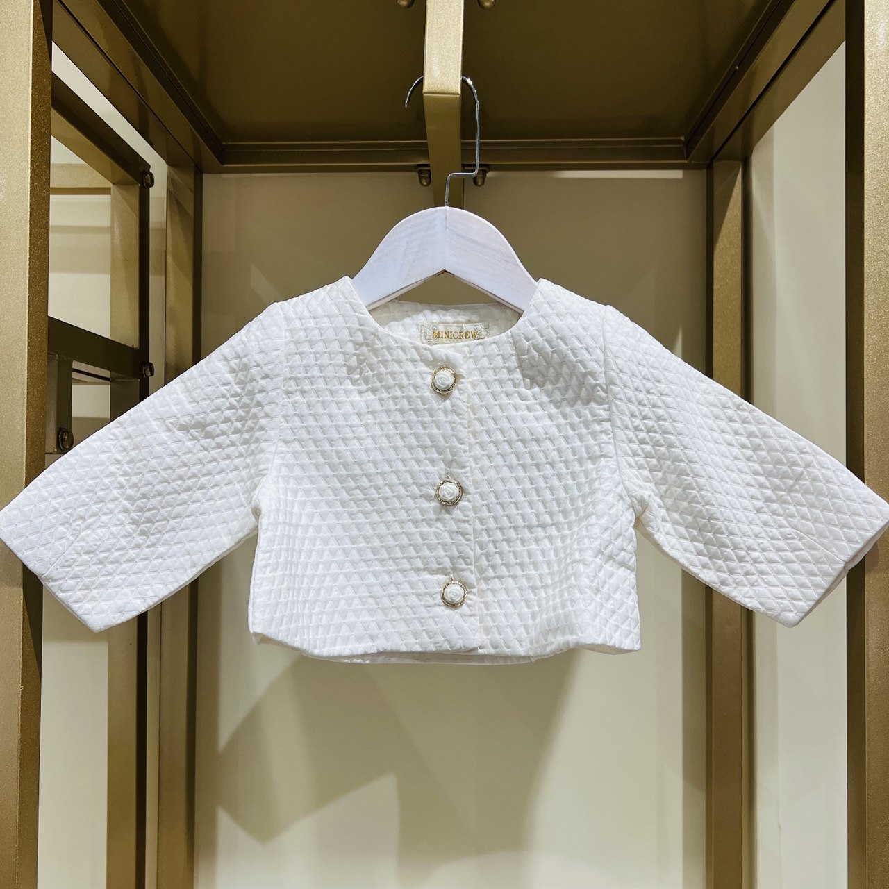 Add a layer of elegance with this classic white textured jacket, perfect for pairing with dresses or formal outfits. Featuring a soft quilted finish and adorned with three pearl-centered buttons, this jacket brings both warmth and charm. Its cropped length and simple round neckline offer a timeless silhouette, ideal for special occasions or stylish everyday layering.